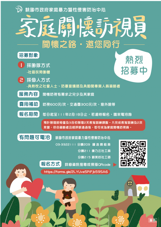 旨揭活動係本府家防中心招募家關員,針對該中心評估有需求之兒少及其家庭進行訪視關懷。預計 3 月初辦理兩天教育訓練課程,凡完成教育訓練及 2 次見習,符合資格者且經評核通過後,即可成為正式家關員。 |