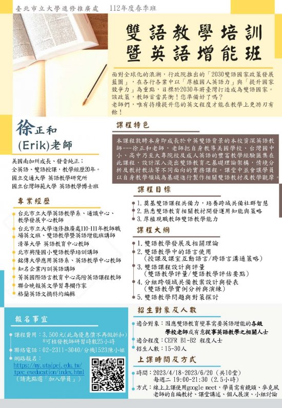 (六) 報名方式:網頁報名(https://my.utaipei.edu.tw/tpec_exeducation/index.html),新學員請先於右上角「加入學員」,再於左欄點選「112 春-成人進修-雙語教學培訓暨英語增能班」。