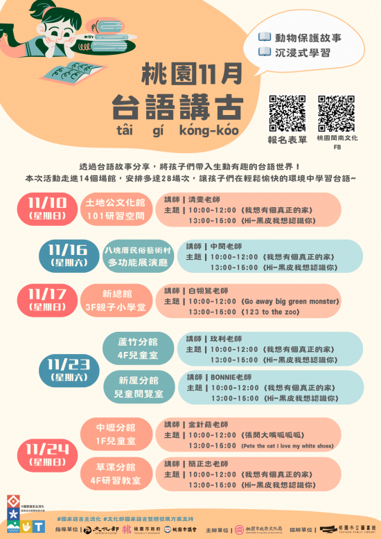 主旨:函轉113年「台語說故事」活動一案,請踴躍報名參加,請查照。 說明: 一、依據桃園市政府文化局113年11月13日桃市文閩字第1130024235號函辦理。 二、為配合文化部核定本府「文化部補助直轄市及縣市政府推動國家語言發展計畫要點」補助案,本府文化局規劃與本市圖書館合辦「台語說故事」系列活動,創造台語環境,鼓勵學童學習母語。 三、上揭活動共計28場次(56小時),自即日起至113年12月15日假本市市立圖書館總館及各區分館及辦理。 四、檢附活動計畫及相關宣傳文宣。 |